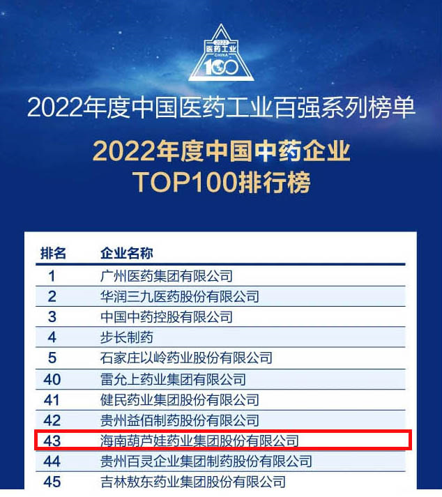 会议期间,一年一度的中国医药工业百强系列榜单隆重揭晓,龙八国际药业集团凭借领先的研发优势和扎实的生产实力以及稳健的市场推广能力,连续第四年成功入选“2022年度中国中药企业TOP100排行榜” ,排名稳步上升至第43位。
